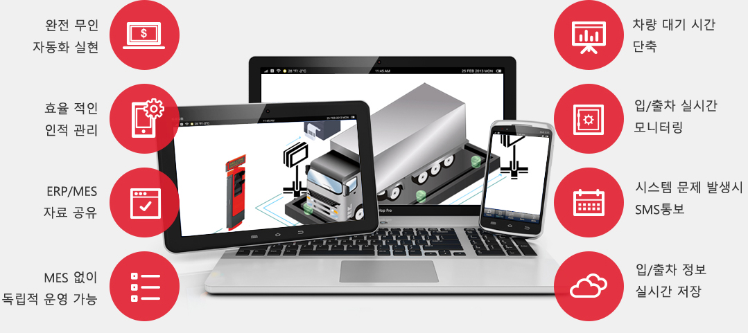 차량 입차 시스템 - 차량 정보(차량번호,거래처,입차시간,입차중량) 기록 - 카메라/RF TAG를 통한 차량번호 자동 인식 - 초보자를 위한 STEP-BY-STEP 사용법 - 모든 정보는 서버에 기록/저장 차량 출차 시스템 - 차량 정보(차량번호,출차시간,출차중량) 기록 - 제품 상차 정보(제품명,제품중량,납품처) 기록 - 카메라/RF TAG를 통한 차량번호 자동 인식 - 초보자를 위한 STEP-BY-STEP 사용법 - 모든 정보는 서버에 기록/저장 관리자 프로그램 - 고객정보,차량정보,제품정보 등록 - 기간별/품목별 출하정보 조회 - 제품 재고 관리 - 실시간 입/출차 정보 모니터링